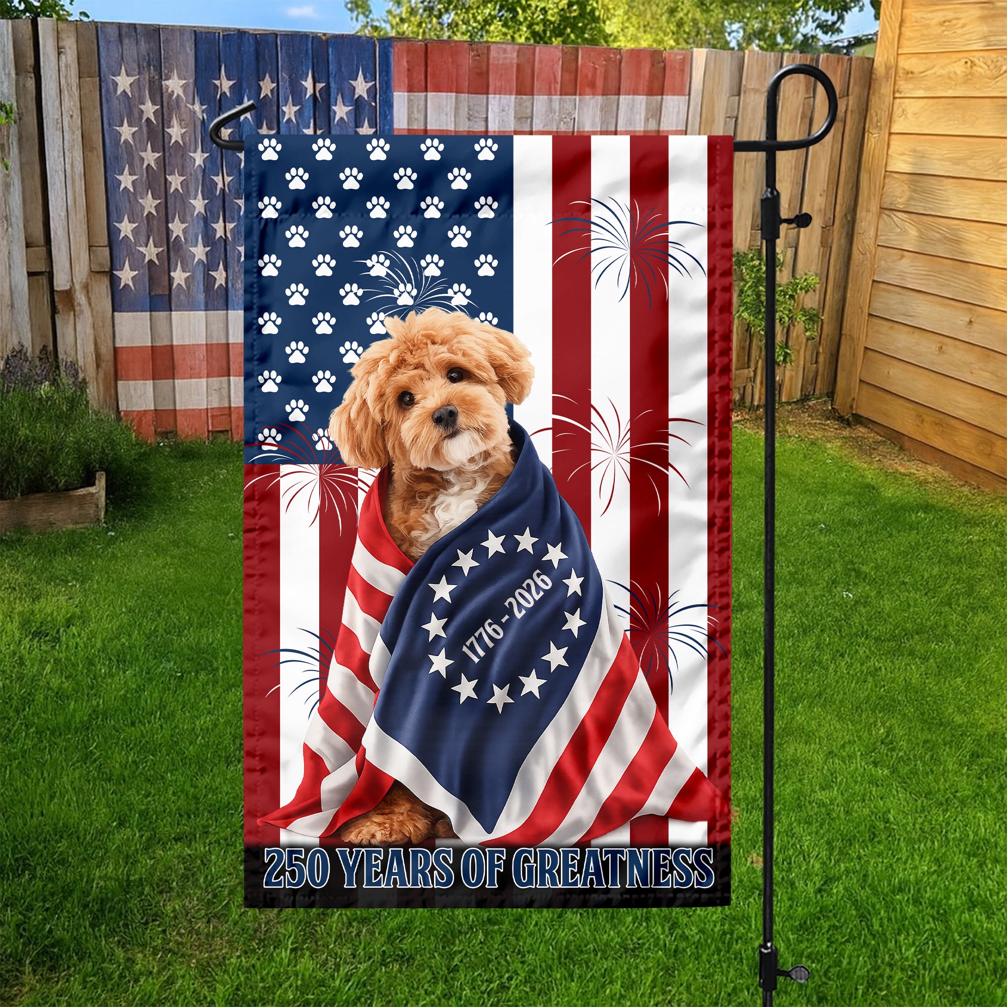 Celebrate America's quarter-century of freedom with this striking patriotic garden flag. Commemorating 250 years of blessings from 1776 to 2026, this design honors the nation's enduring spirit and heritage. Perfect for displaying pride in your yard, porch, or garden, the flag features bold patriotic imagery that captures the essence of American independence. Made for durability and visibility, it's an ideal way to show your patriotic pride during holidays, Independence Day, or year-round. Let this meaningful flag be a testament to your love of country and gratitude for America's remarkable journey.