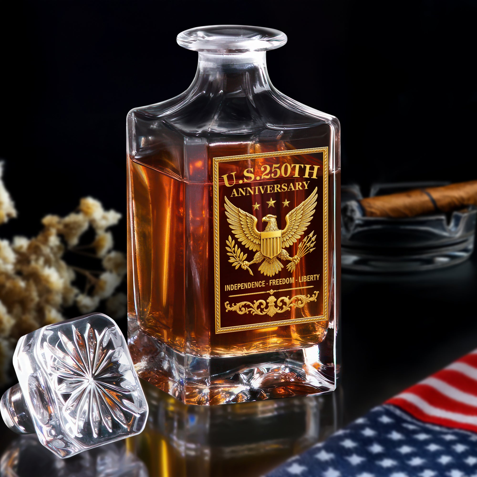 Celebrate 250 years of American freedom with this elegant US 250th Anniversary Decanter. Crafted to honor a rich heritage, its timeless design captures the spirit of liberty and unity. Perfect for showcasing your finest spirits, this decanter combines commemorative pride with sophisticated style, making it a meaningful addition to any collection or a thoughtful gift for those who cherish freedom. Raise a glass to history and future memories with this distinguished keepsake.
