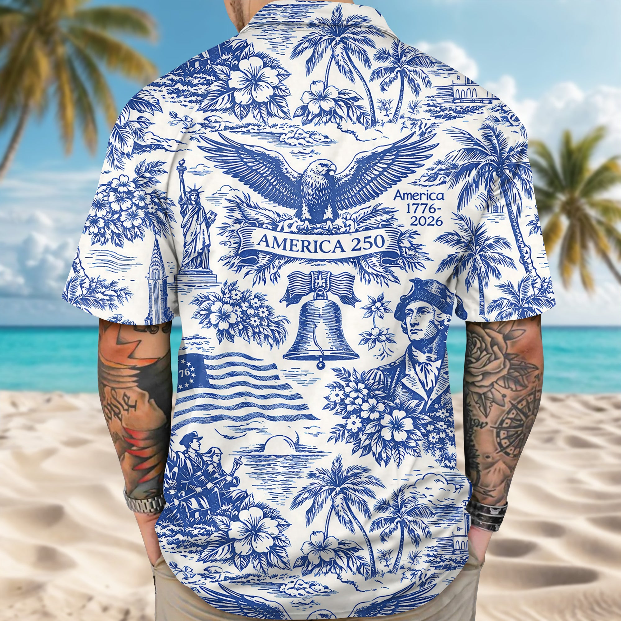 Celebrate America's 250th anniversary in style with this stunning patriotic Hawaii shirt featuring an elegant Toile de Jouy design. This unique blend of classic French-inspired patterns and patriotic imagery creates a sophisticated yet festive look perfect for commemorative occasions. The intricate toile detailing showcases iconic American symbols woven throughout the fabric, offering a refined alternative to traditional patriotic wear. Ideal for history enthusiasts and fashion-forward patriots alike, this shirt lets you honor the nation's milestone while making a distinctive statement. Comfortable, eye-catching, and conversation-starting—the perfect way to wear your pride this historic year.