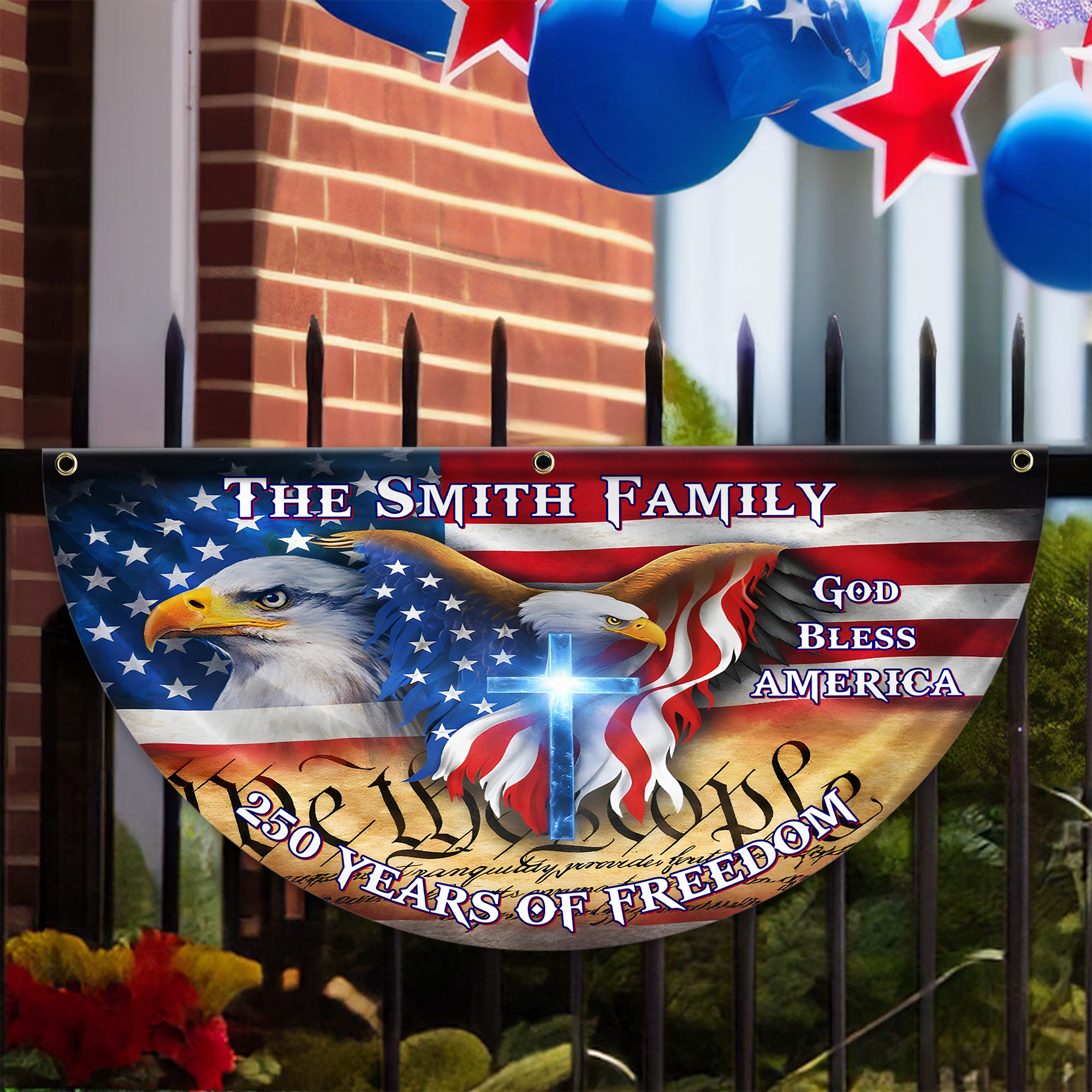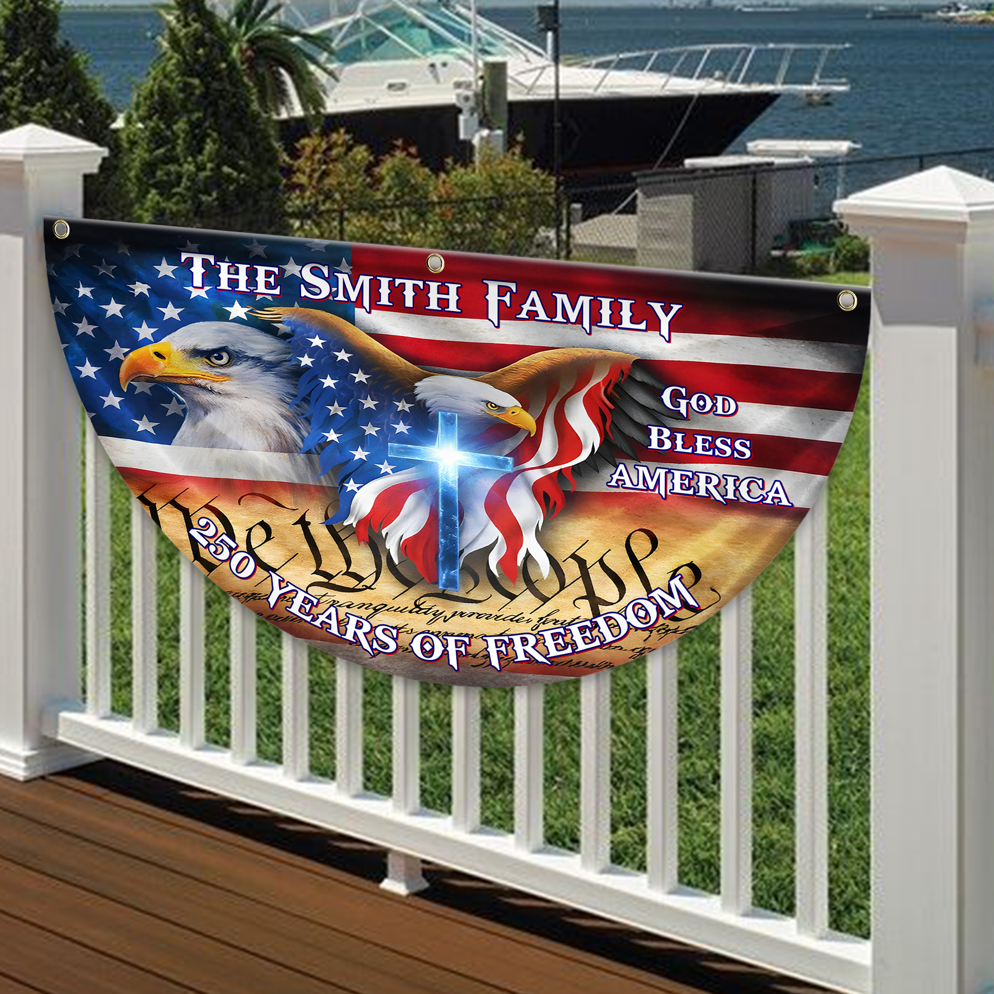 Display your family pride with this striking custom American flag featuring a majestic eagle and your personalized name. Crafted with patriotic design elements, this non-pleated fan flag combines timeless American symbolism with personal customization. Perfect for home displays, outdoor celebrations, or showing your national spirit year-round. The durable construction ensures vibrant colors and crisp details that withstand the elements. Make a bold statement that's uniquely yours—a meaningful way to celebrate your heritage and values with every glance.