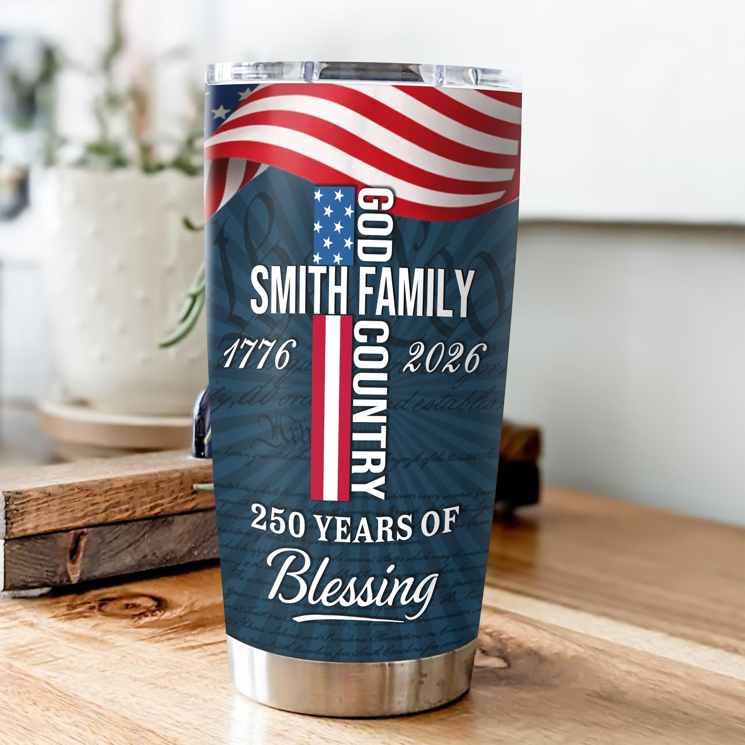 Celebrate your family's heritage with this striking patriotic tumbler, custom-engraved with your family name. Featuring a bold "250 Years of Blessing God" design, it's the perfect gift for those who take pride in American traditions and faith. This premium 32oz tumbler keeps beverages at the ideal temperature while making a powerful statement about your values. Whether displayed at home or taken on the go, it's a meaningful way to honor your family legacy and patriotic spirit. An ideal present for holidays, reunions, or any occasion calling for something truly personal and distinctive.
