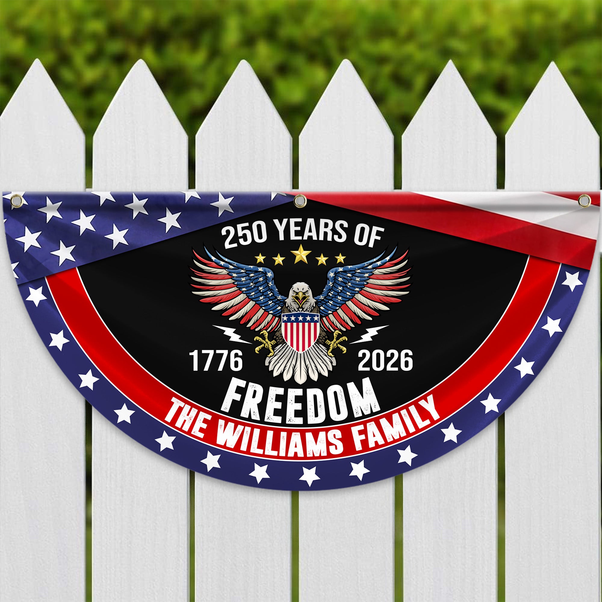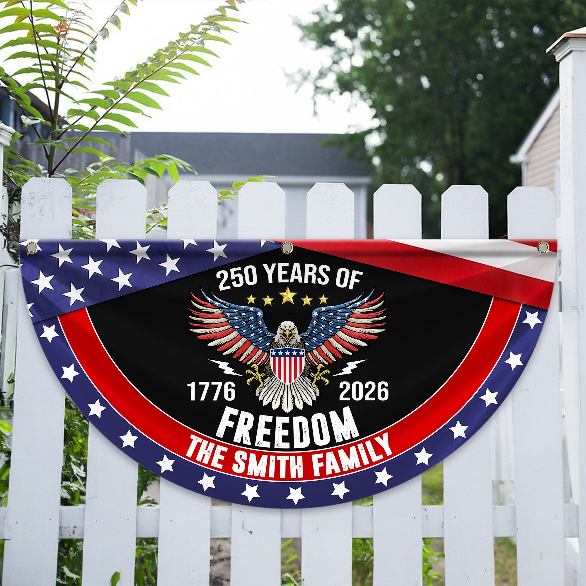 Celebrate America's remarkable 250-year legacy with this striking USA 250 Years Of Freedom custom family name non-pleated fan flag. Personalize your patriotic display by adding your family name to this commemorative design, creating a meaningful connection between your household and the nation's enduring freedom. The innovative non-pleated fan construction provides superior wind resistance and visual impact, ensuring your flag stands out in any setting. Engineered with weather-resistant materials, it delivers fade-resistant color and long-lasting durability through every season. Transform your home's exterior into a powerful symbol of pride—one that honors both American heritage and your family's story. This distinctive flag speaks volumes about your values and makes an unforgettable impression on visitors and neighbors alike.