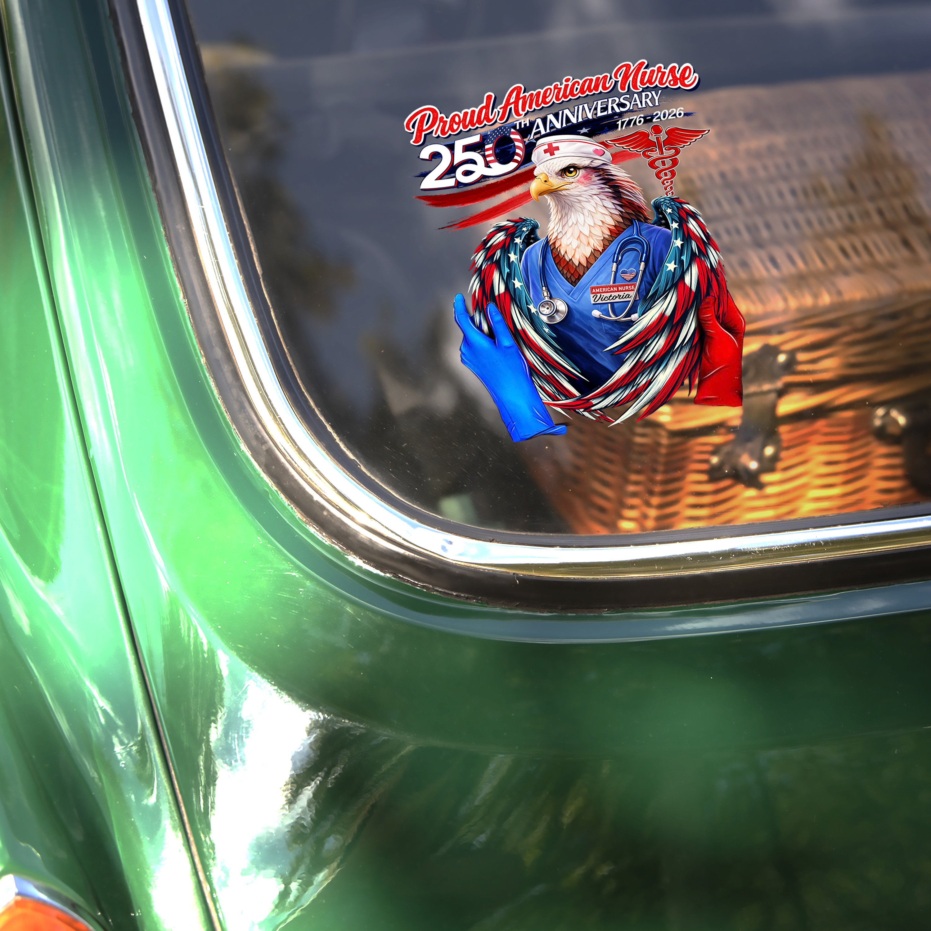 Celebrate your dedication to nursing with this striking personalized car window decal, custom-designed to honor your name and profession. Perfect for the 250th anniversary milestone, this decal combines patriotic pride with professional recognition, letting fellow drivers know about the American hero behind the wheel. Made for durability and visibility, it's an ideal way for nurses to showcase their commitment to healthcare while adding a personal touch to your vehicle. Display your calling with pride—because every shift matters.