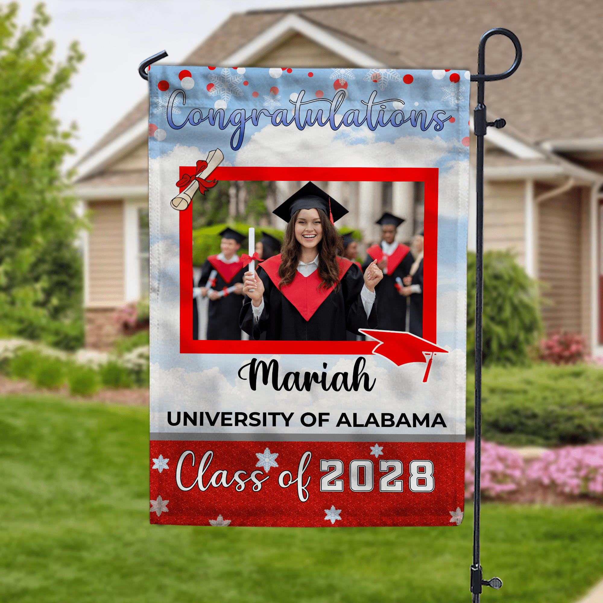 Get this Personalized Custom Garden Flag which is specially made for Graduation Day to express how proud you are of your seniors. It's not only a unique hom decor but also an adorable graduation gift to share the good news with your neighbors.