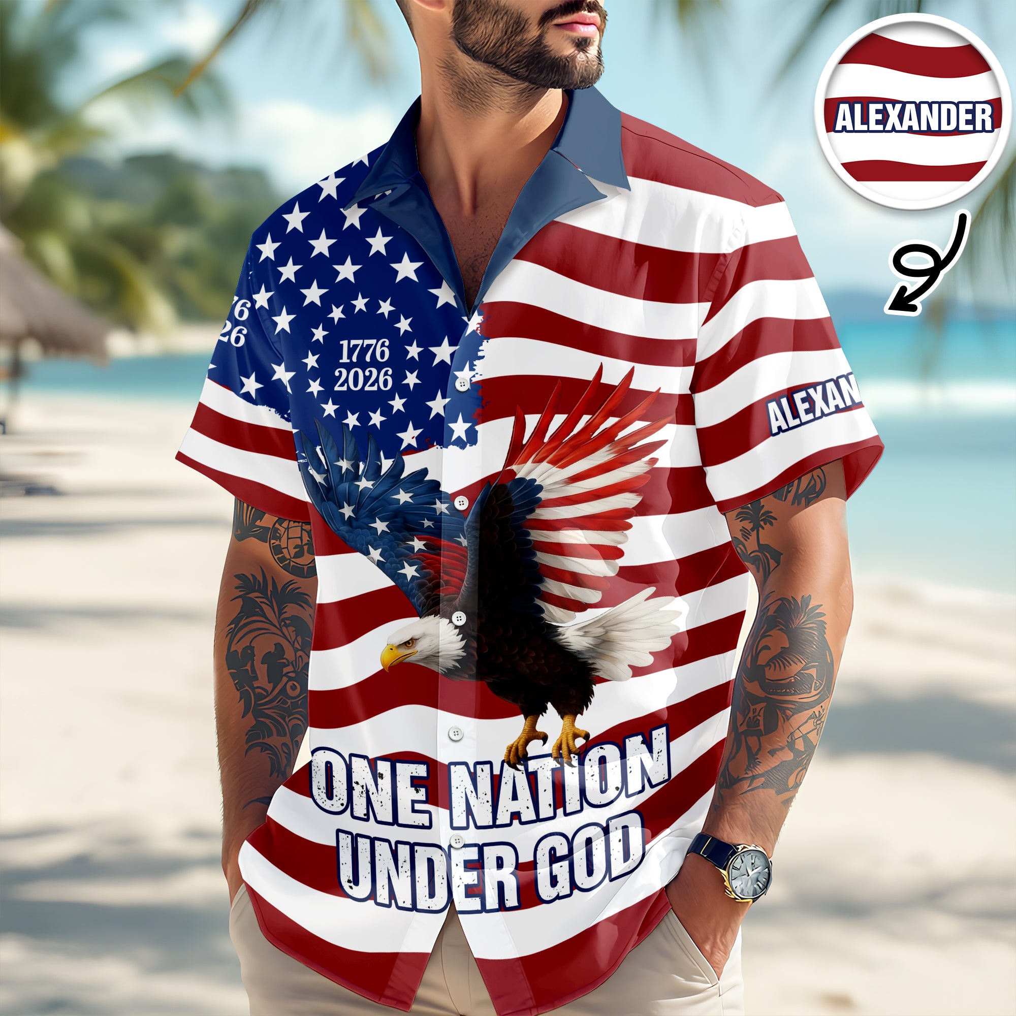 Celebrate America's 250th anniversary with this striking personalized Hawaii shirt featuring a majestic eagle and patriotic flag design. Lightweight and breathable, it's designed for comfort whether you're at a summer celebration or everyday wear. Customize it with your personal touch to make this historic milestone truly yours. Own a piece of American heritage that honors 250 years of freedom and independence.