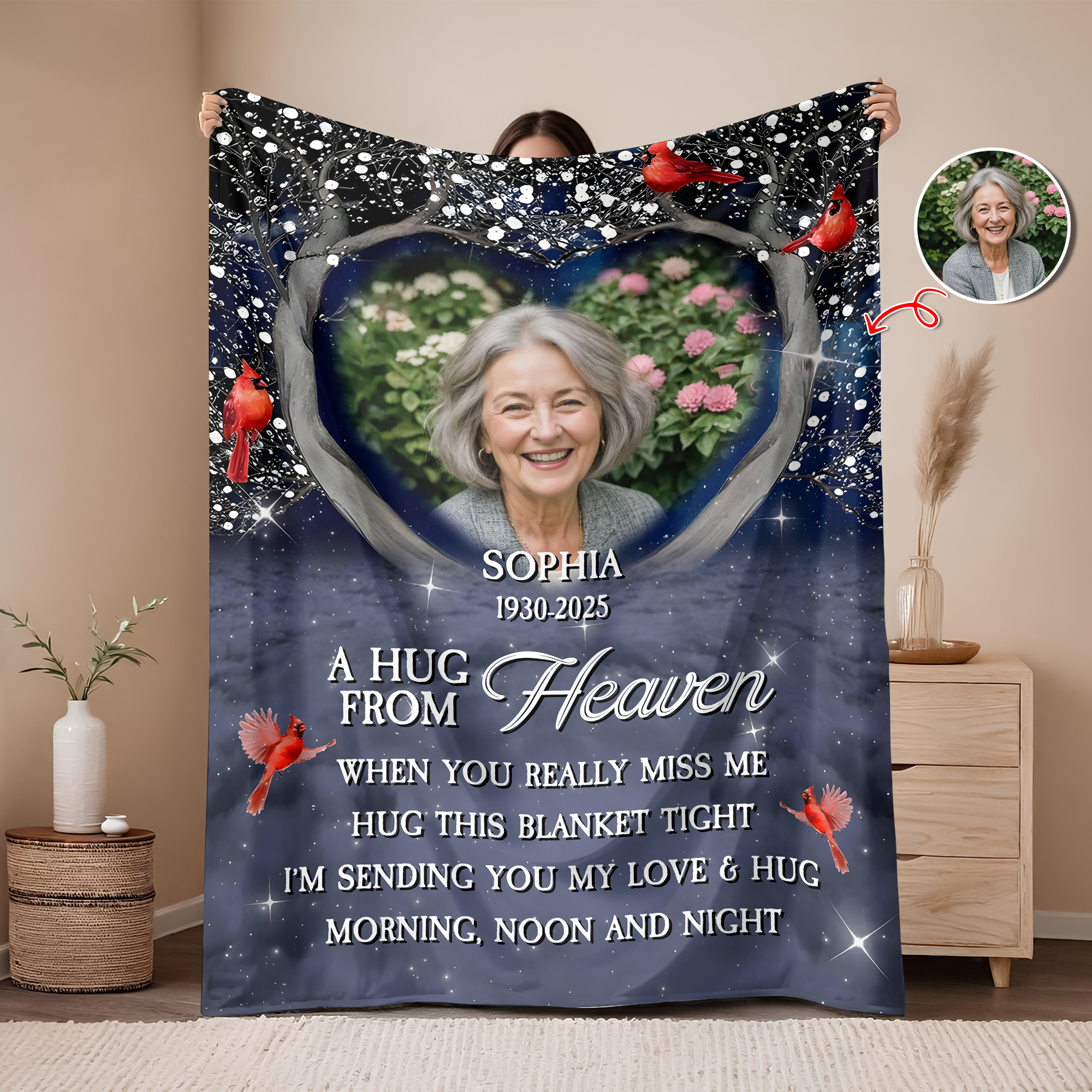 Wrap your loved ones in warmth and memories with the Personalized A Hug From Heaven Custom Photo Blanket. This heartfelt keepsake lets you showcase a cherished photo, creating a comforting tribute to dad or mom. Perfect for honoring their memory, this soft, cozy blanket offers a tangible hug from heaven, bringing comfort and love to your home every day.
