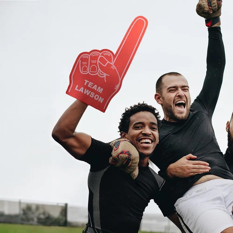 Show your team spirit with this custom foam finger, the ultimate game day essential. Personalize it with your favorite team name, player number, or motivational message to stand out in the crowd. Lightweight and comfortable to wear for hours, this vibrant foam finger amplifies your cheers and gets everyone around you pumped up. Perfect for football games, basketball matchups, or any sporting event where you want to make your voice heard. Let your passion shine and rally your squad with a foam finger that's uniquely yours.