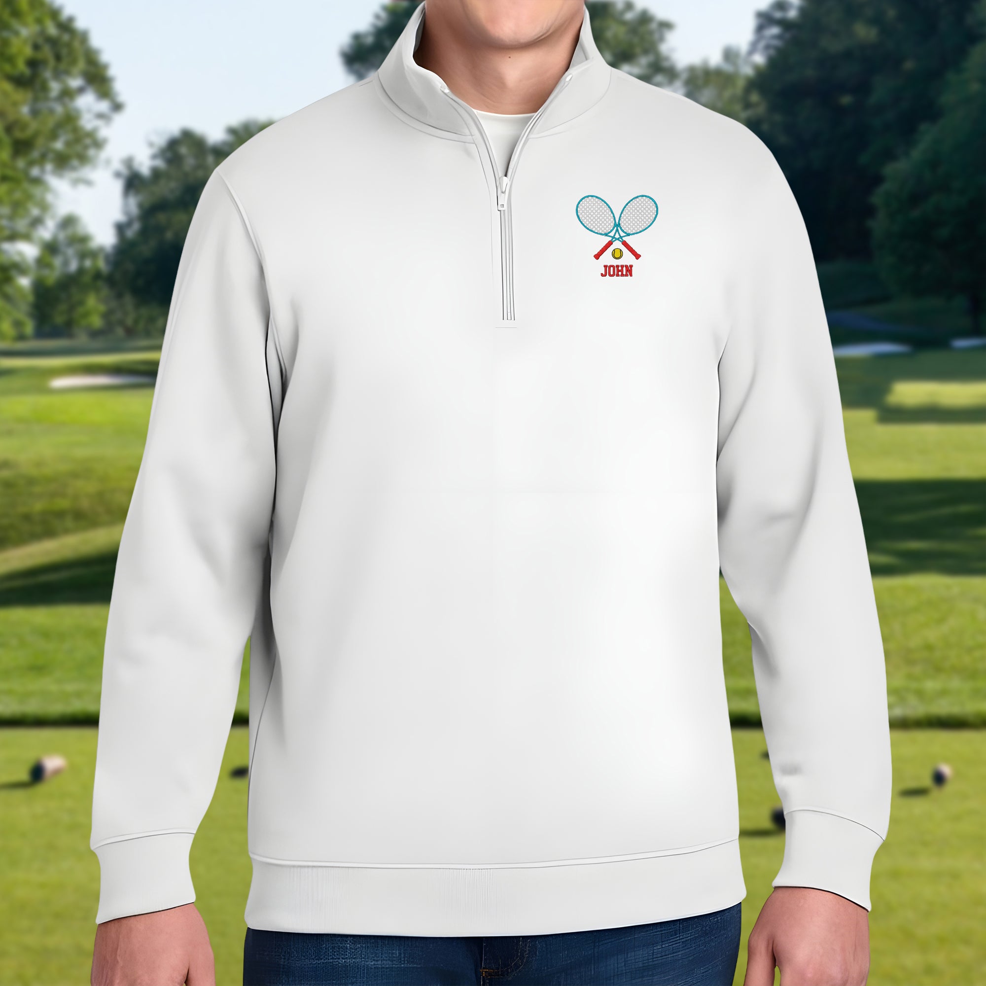Elevate your tennis game with this custom quarter zip sweater, designed for players who demand both style and comfort on and off the court. Featuring personalized name embroidery, this piece celebrates your passion for tennis while delivering premium warmth and durability. The classic quarter zip design offers easy layering and adjustable ventilation, making it perfect for practice sessions, matches, or casual wear. Crafted with quality materials, it combines athletic functionality with a polished look that stands out. Make it uniquely yours and show your dedication to the sport you love.