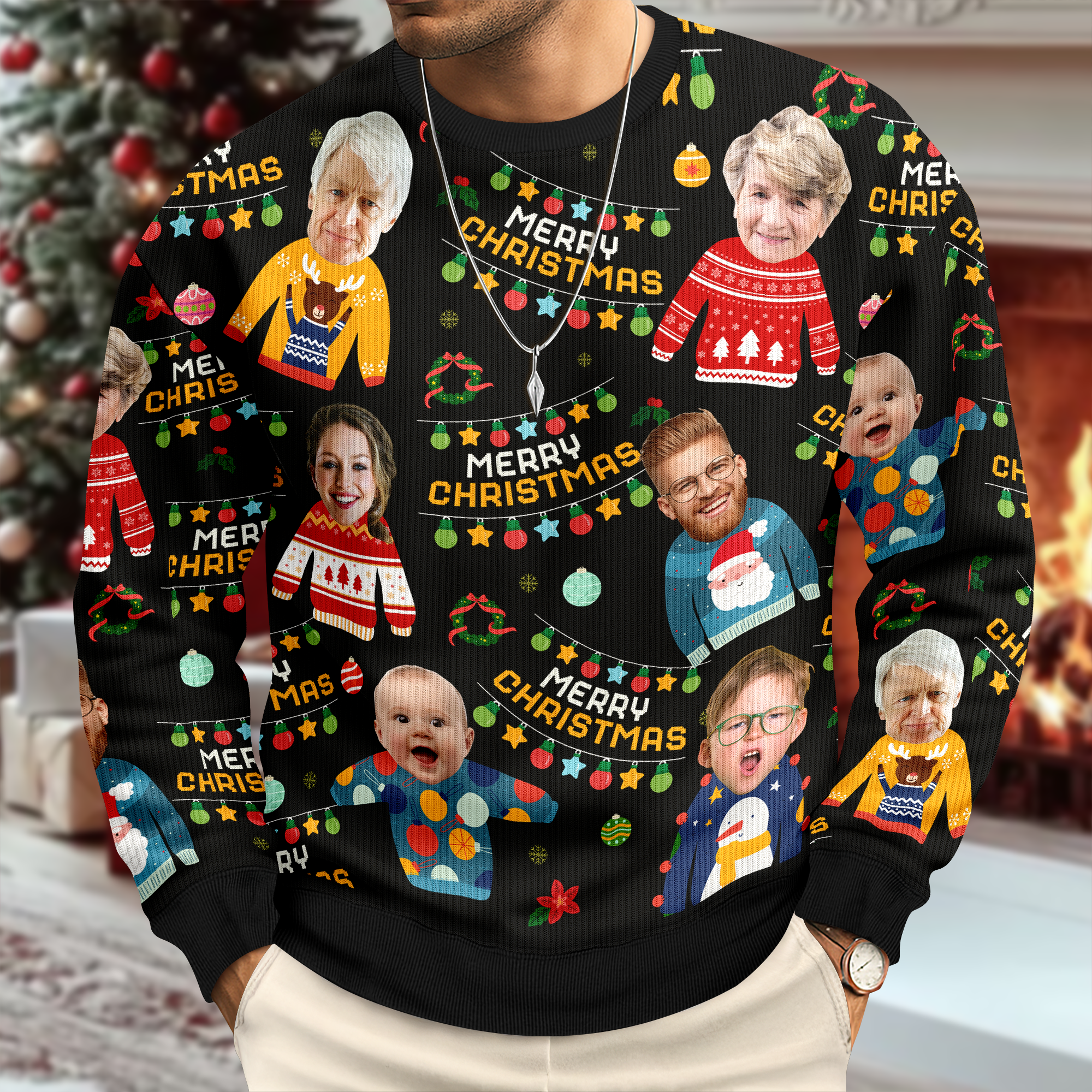 Spread holiday cheer with this hilarious custom family photo ugly Christmas sweater! Perfect for festive gatherings, family photos, and laugh-out-loud moments, this one-of-a-kind design features your favorite memories transformed into wearable art. Whether you're hosting a holiday party or looking for the ultimate gag gift, this sweater delivers personality and warmth in equal measure. Customize it with your own family photos to create an unforgettable keepsake that'll have everyone smiling. Cozy, quirky, and completely unique—the gift that says you really know how to have fun this season.