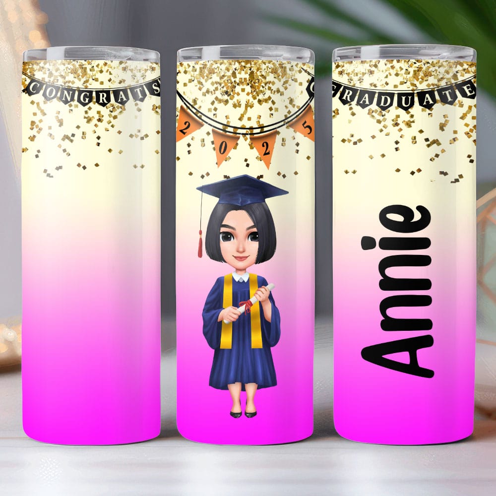 Celebrate their achievements with our Congrats Graduate Personalized Skinny Tumbler! Perfect for a graduation gift, this tumbler is both practical and sentimental. Keep drinks hot or cold for hours while showing off their accomplishments. Personalize with their name and graduation year for a truly meaningful gift!