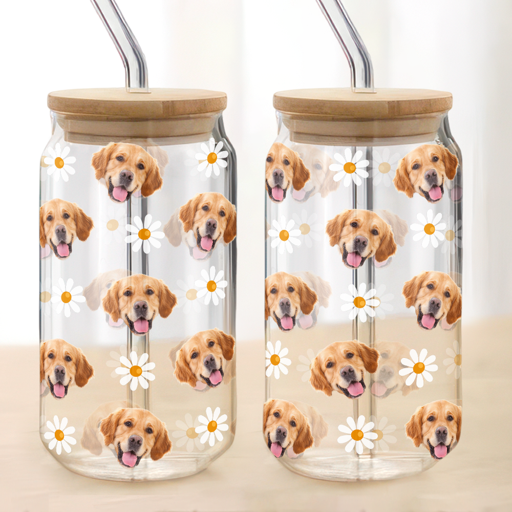 Capture the love for your furry friend in a unique way with our Custom Face Photo With Icon Dog Glass Can! Showcase your pup's adorable face on this glass can, perfect for any dog lover. The sturdy lid secures your drink while the photo adds a personal touch. Cheers to your four-legged companion!