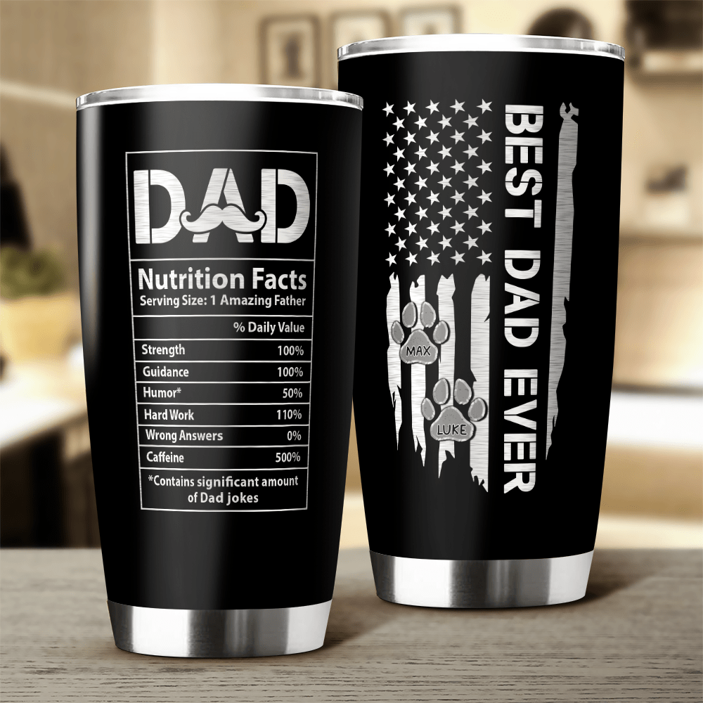 Indulge in the best, with our Best Dog Dad Ever Dad Nutrition Facts Dog Tumbler. Made for the ultimate dog lover, this personalized gift is a must-have for any dog dad. With a sleek design and the title of "Best Dog Dad Ever," this tumbler will make any drink taste that much better. Elevate your morning coffee or evening beverage with this exclusive tumbler, because being a dog dad is truly something to celebrate.