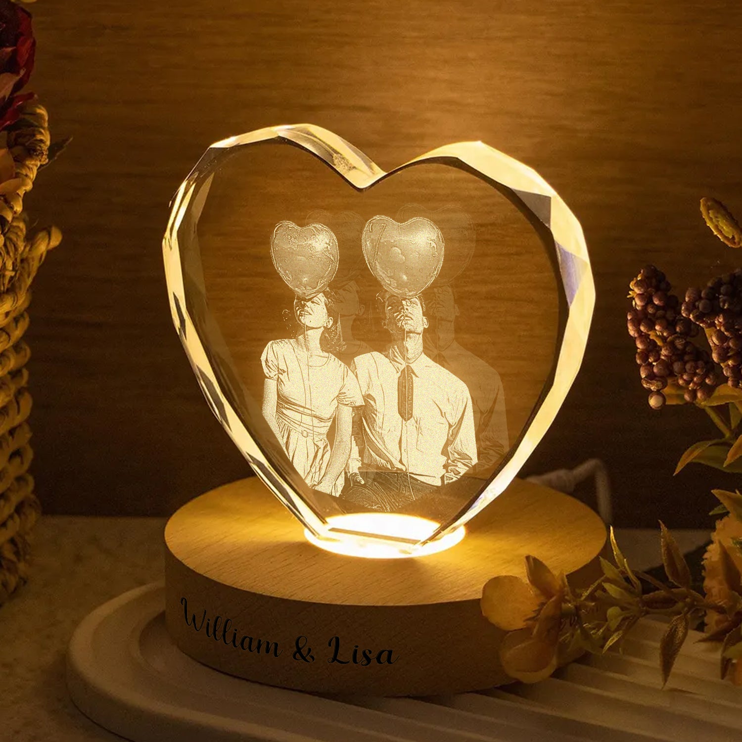 Celebrate your love with this stunning custom couple photo engraved crystal featuring integrated LED lighting. Each personalized piece transforms your favorite memory into an elegant keepsake that glows beautifully in any room. An unforgettable gift for anniversaries, weddings, or any milestone moment together.