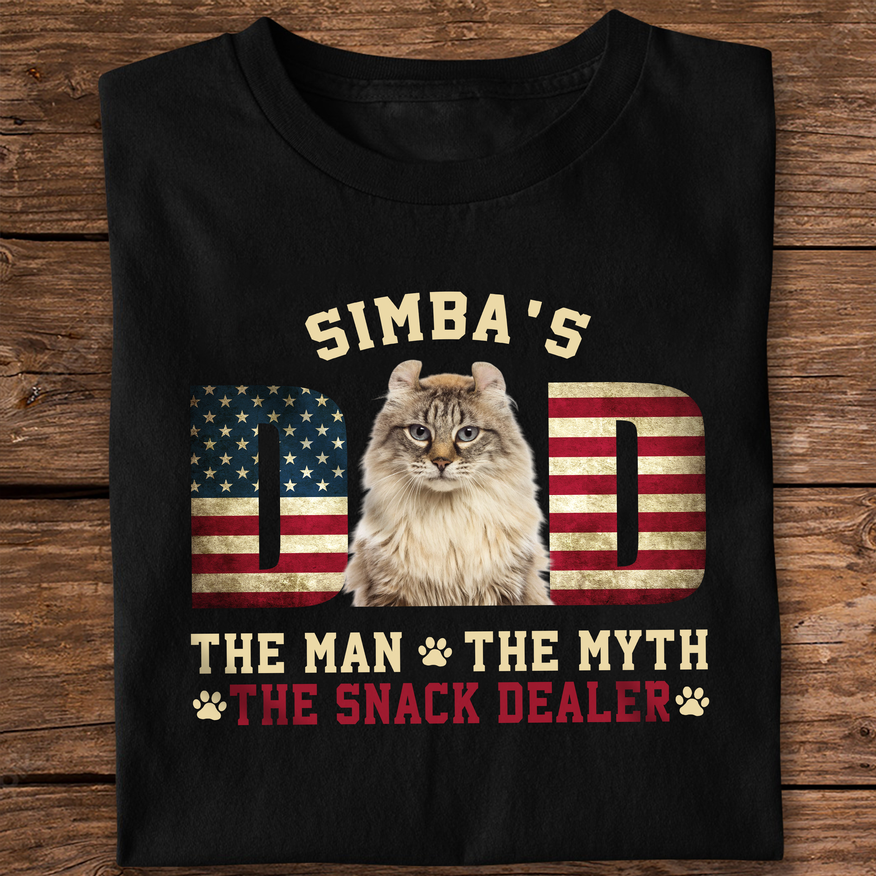 Celebrate the dog dad in your life with our Custom Photo Cat shirt! This American Flag design proudly displays the phrase "The Man The Myth The Dealer" with a space for a custom photo of his best friend. Give the gift of love and style with our shirt.