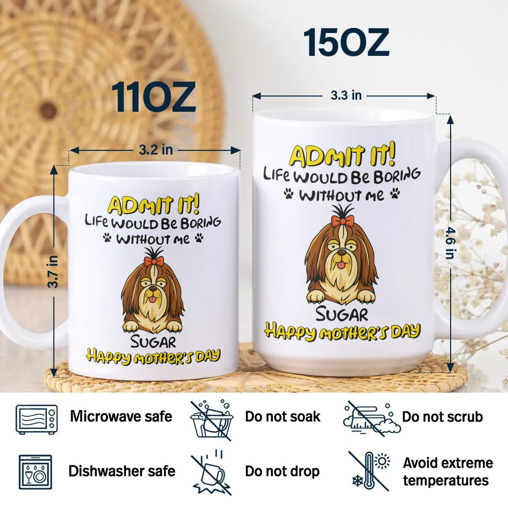 Add some humor and personality to your daily cup of coffee with our Admit It! Life Would Be Boring Without Me Dog Personalized White Mug! Great gift idea for dog lovers, this mug is both funny and unique, making it a must-have item for any fun-loving person. Start your day with a smile today!