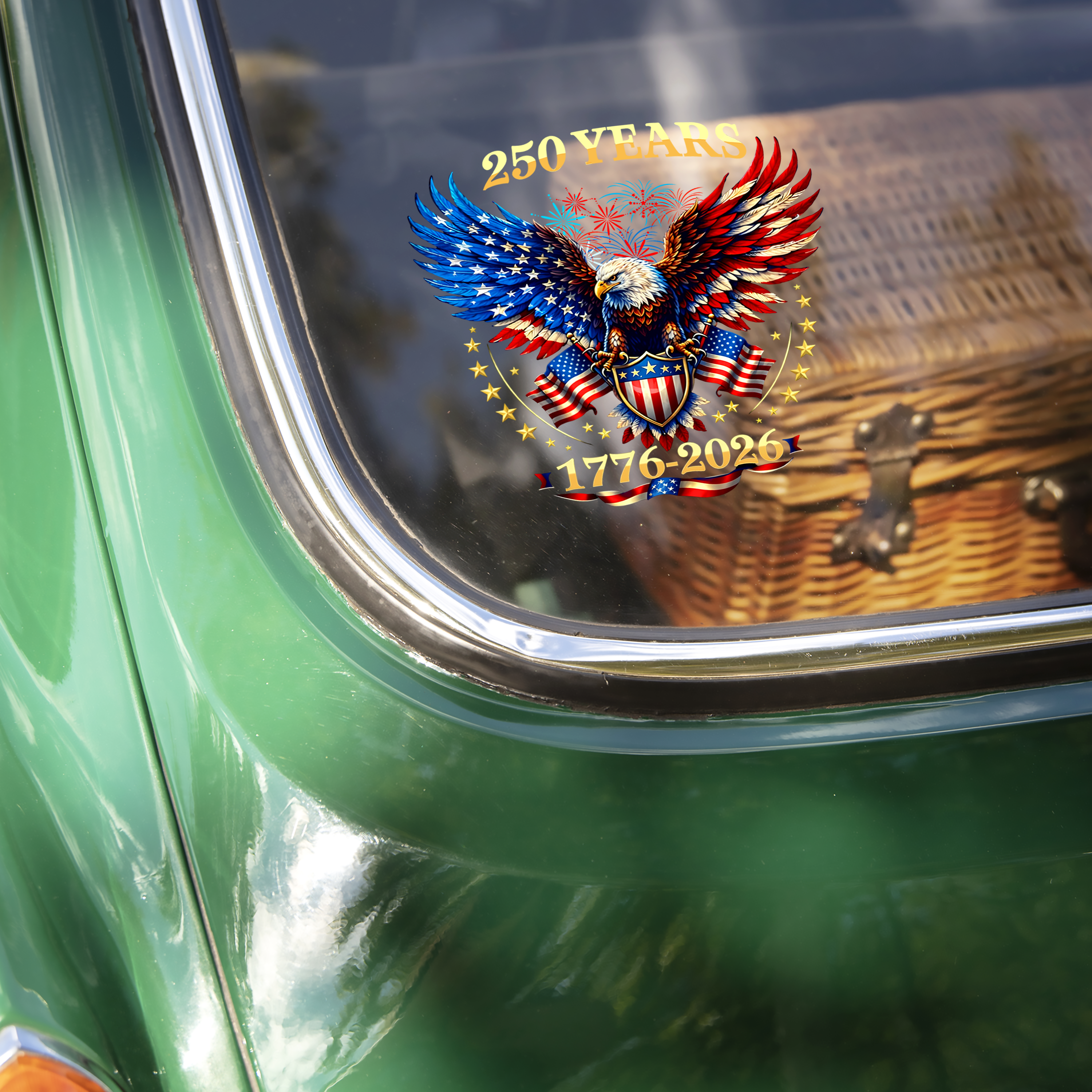Celebrate a quarter-millennium of American heritage with this striking car window decal. Featuring the iconic "250 Years American 1776-2026" design, this durable sticker commemorates the nation's rich history and enduring spirit. Perfect for patriotic drivers who want to showcase their pride, the decal adheres smoothly to any vehicle window while resisting weather, UV rays, and fading. Make a bold statement on the road with this timeless tribute to American tradition. Whether you're a history enthusiast or simply proud to be American, this decal transforms your car into a rolling monument to 250 years of achievement and resilience.