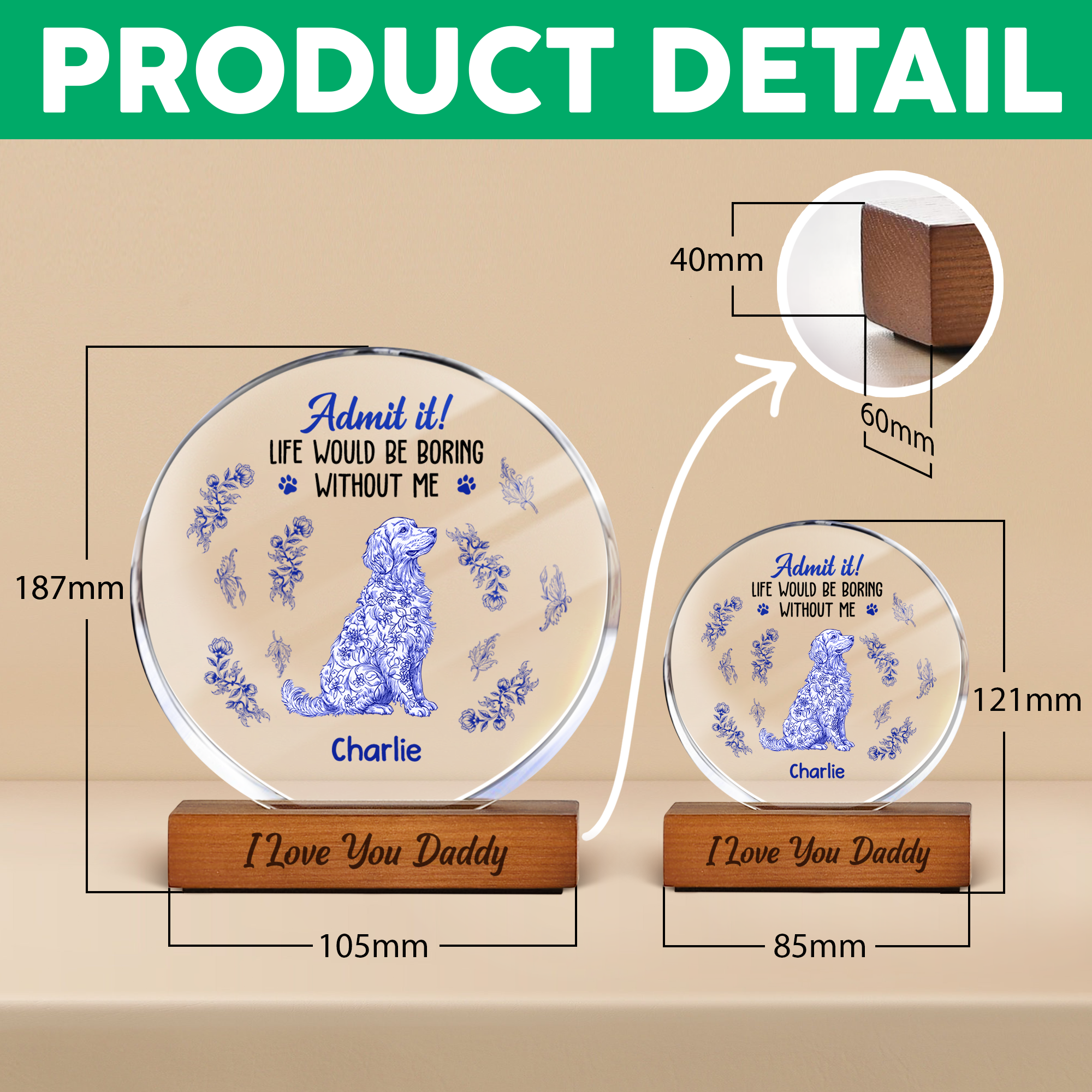 Celebrate your unique style with this personalized Round Acrylic Block featuring a charming Chinoiserie Toile De Jouy design and a playful dog motif. Perfect for adding a touch of elegance and personality to any space, this decorative piece makes a thoughtful gift or a delightful accent for your home or office. Its clear acrylic construction ensures durability while showcasing intricate details, making life a little less boring and a lot more stylish.